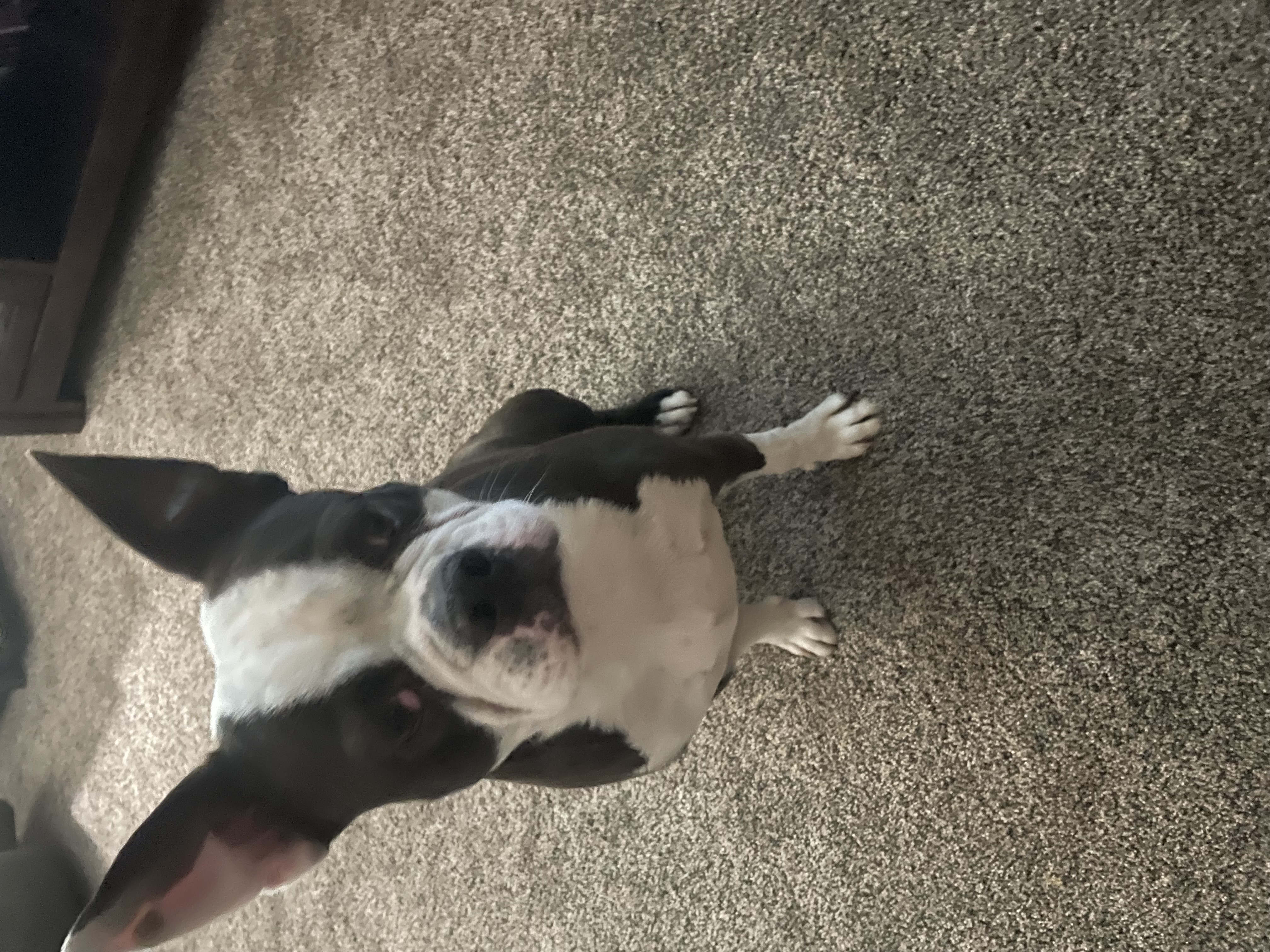 Staffordshire Terrier, has had puppies Dark brown with caramel streaks White dappled chest About 40-45 pounds