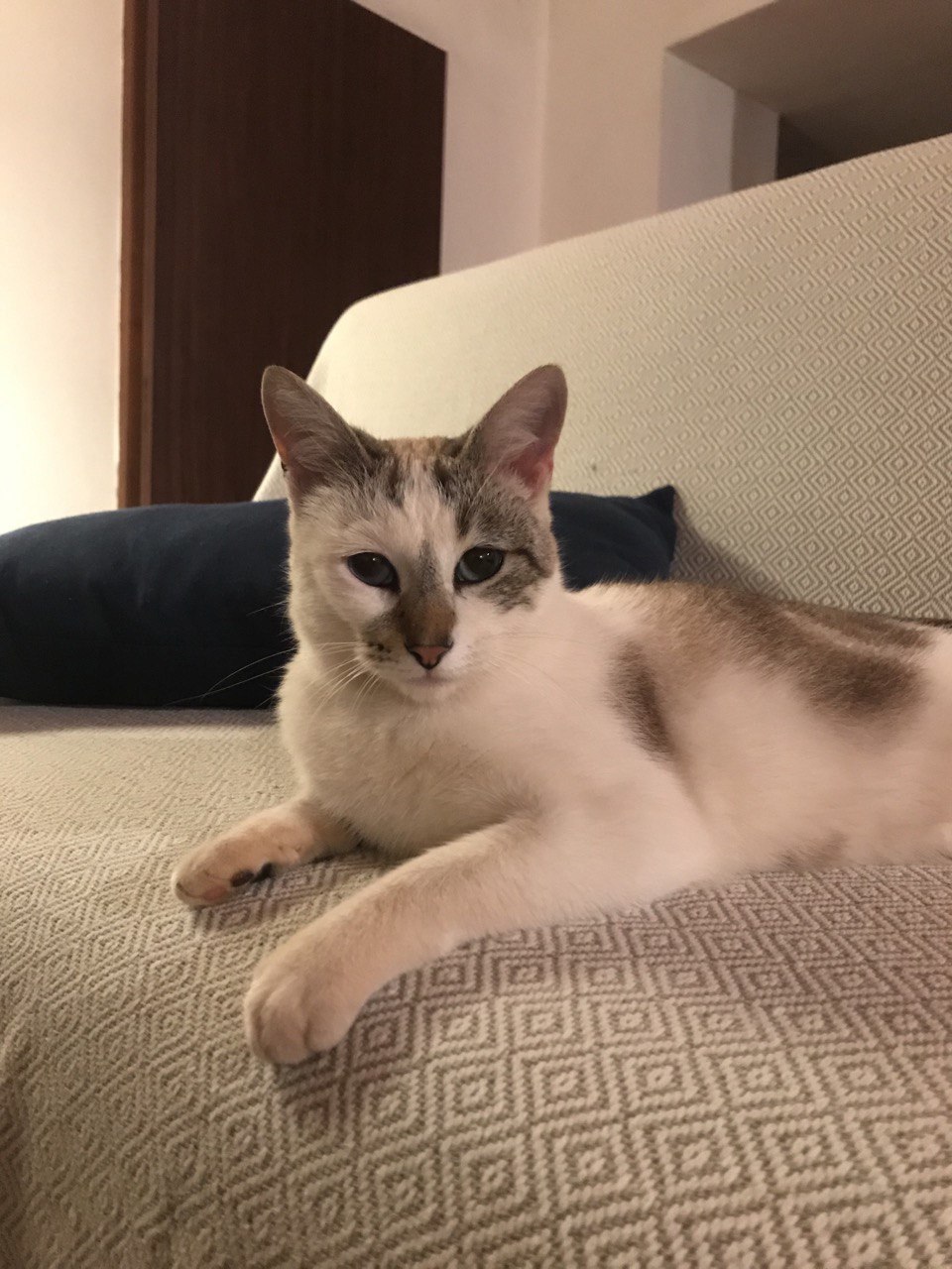 silky grey fur, strip on nose, long white whiskers/eyebrows, 4 white paws... age under 1 year old, very sweet, friendly feral...